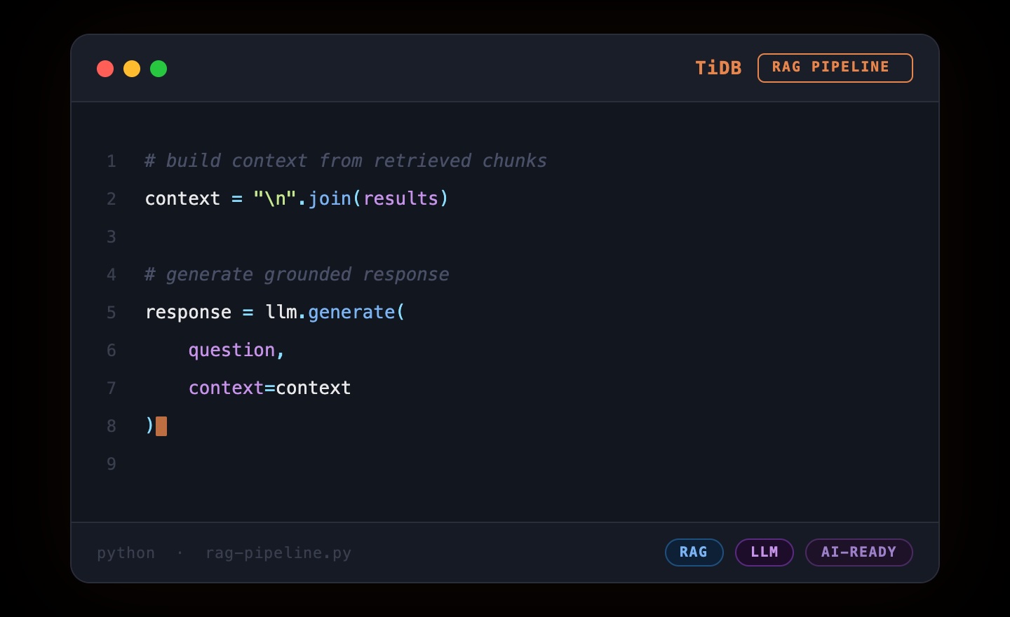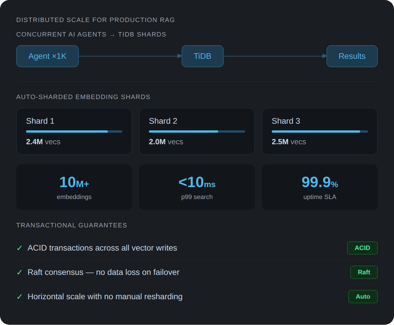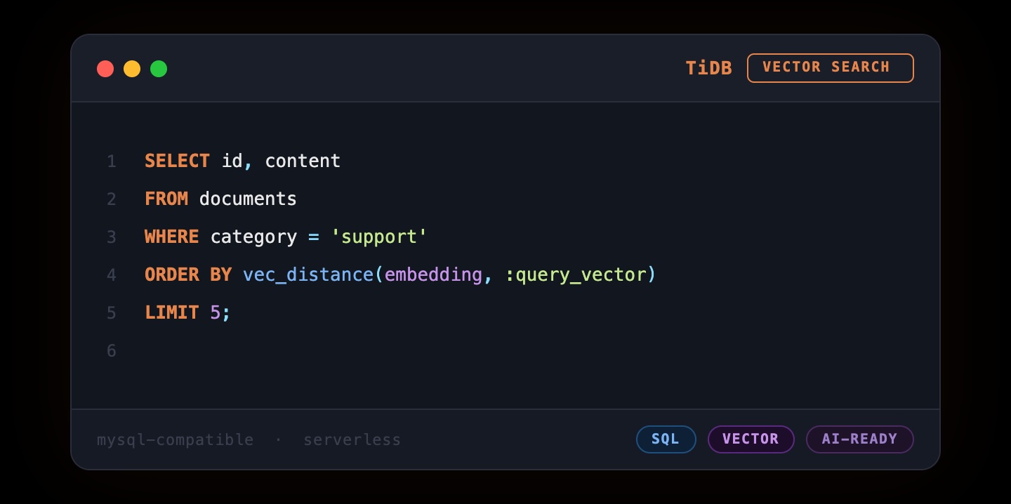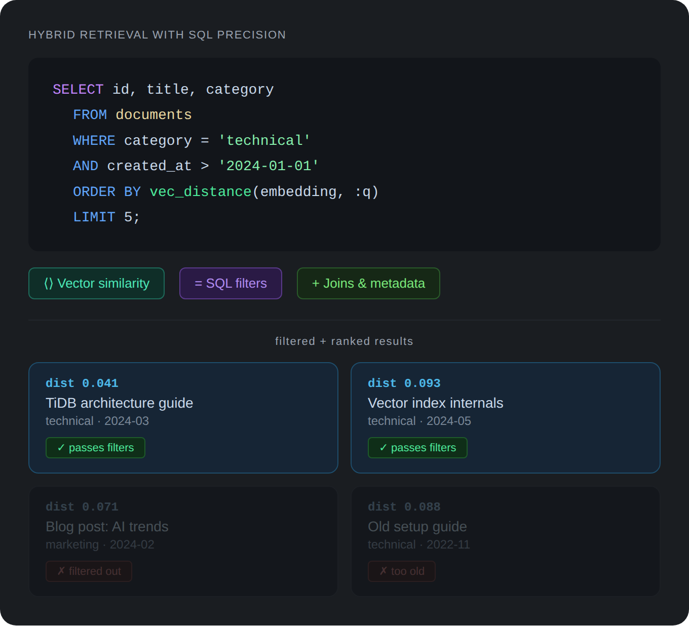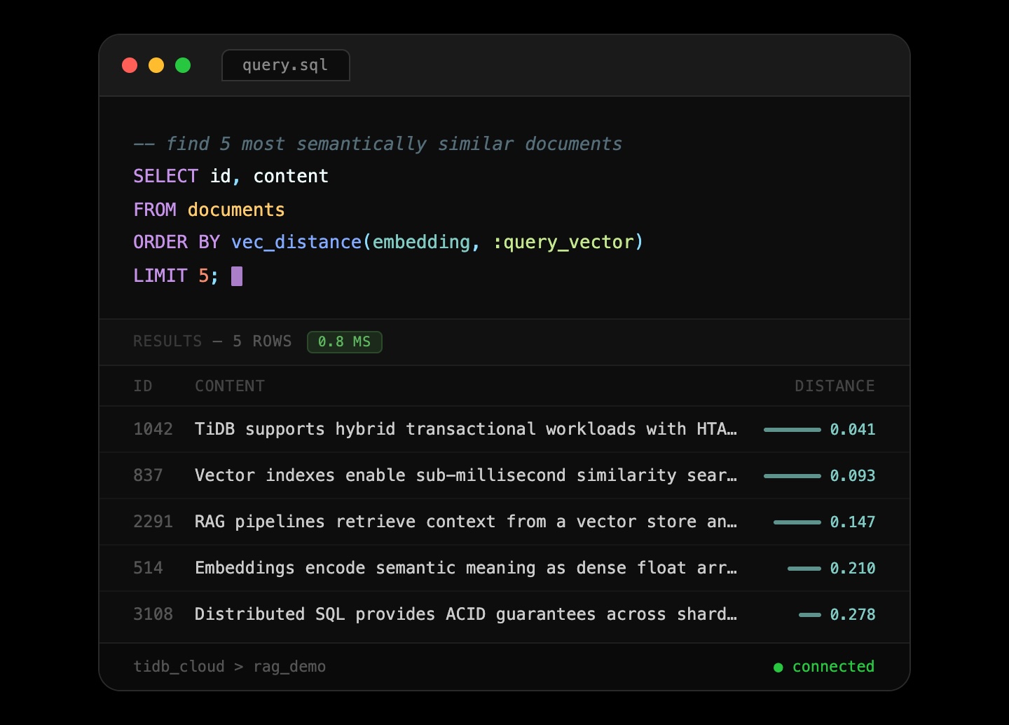 TiDB integrates vector storage, hybrid querying, and scalable execution in a single system—making it straightforward to build production-ready retrieval workflows.