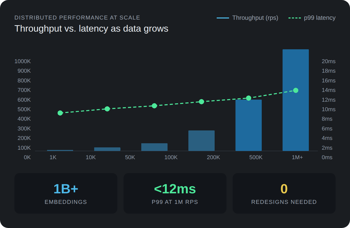 Combine vector similarity with relational filters, joins, and metadata-aware queries using familiar SQL—without separate search infrastructure.