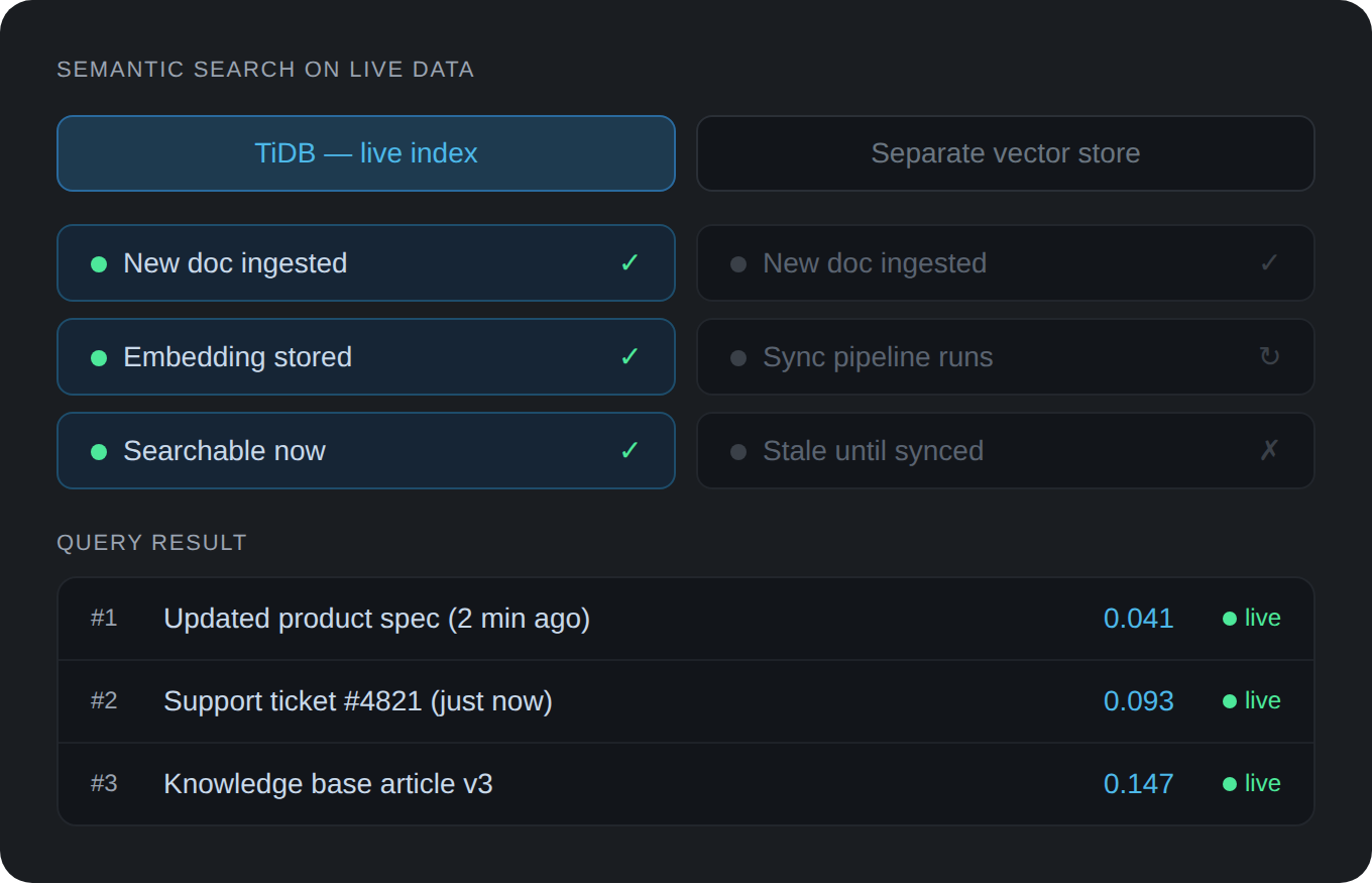 TiDB brings semantic search, structured filtering, and live application data together—so retrieval stays accurate, consistent, and ready for real-world AI workloads.