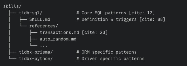 - Select: The agent selects the relevant skill folder (e.g., skills/tidb-sql when generating SQL).