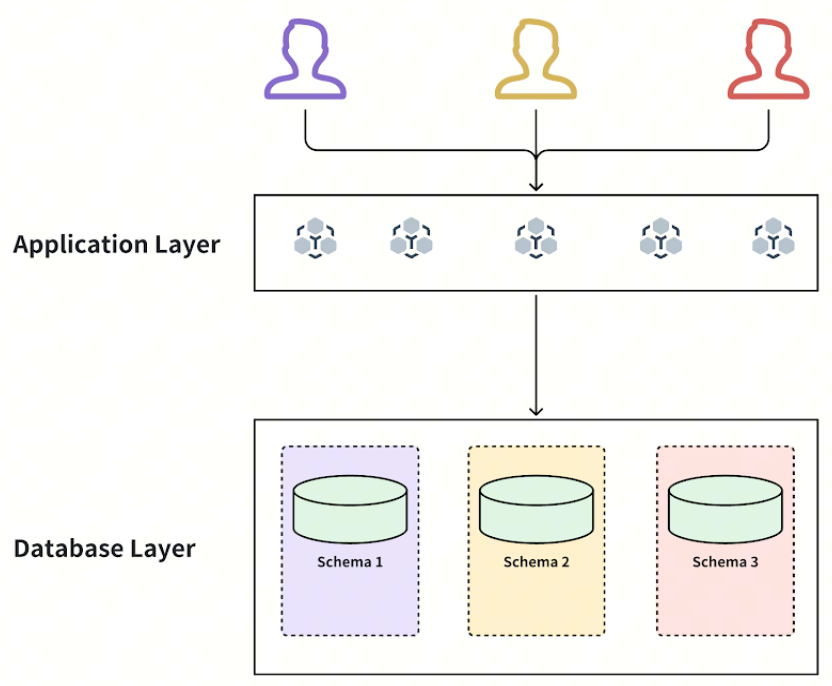 A diagram showing a typical representation of a one-schema-per-tenant (database = schema) model for Atlassian before Forge