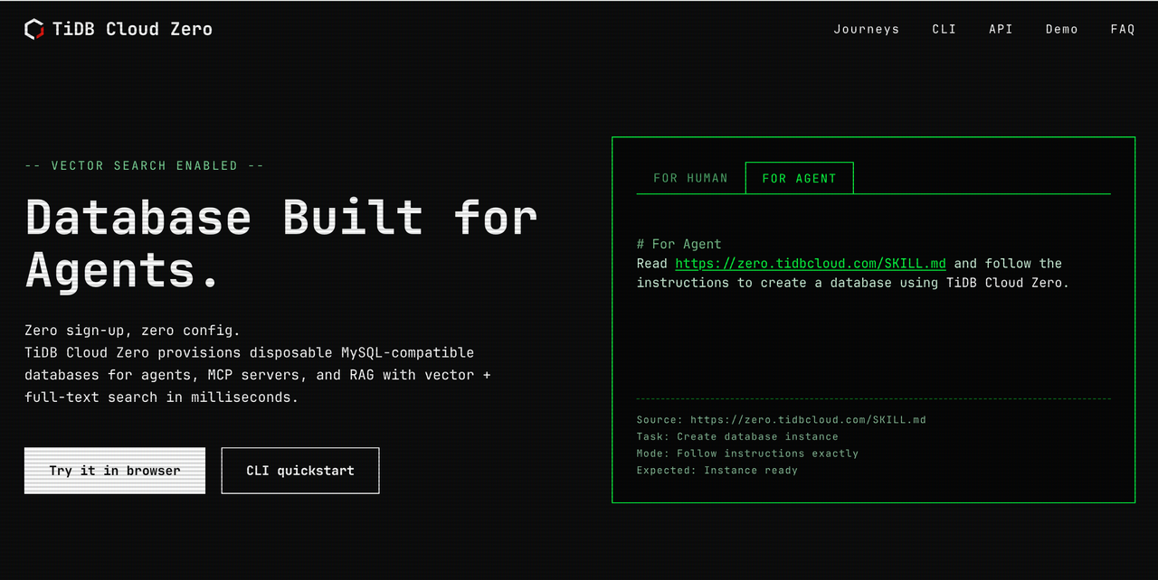 TiDB Cloud Zero is designed for a new generation of AI agents and developers who want instant access to a real production-grade database without the traditional onboarding friction.