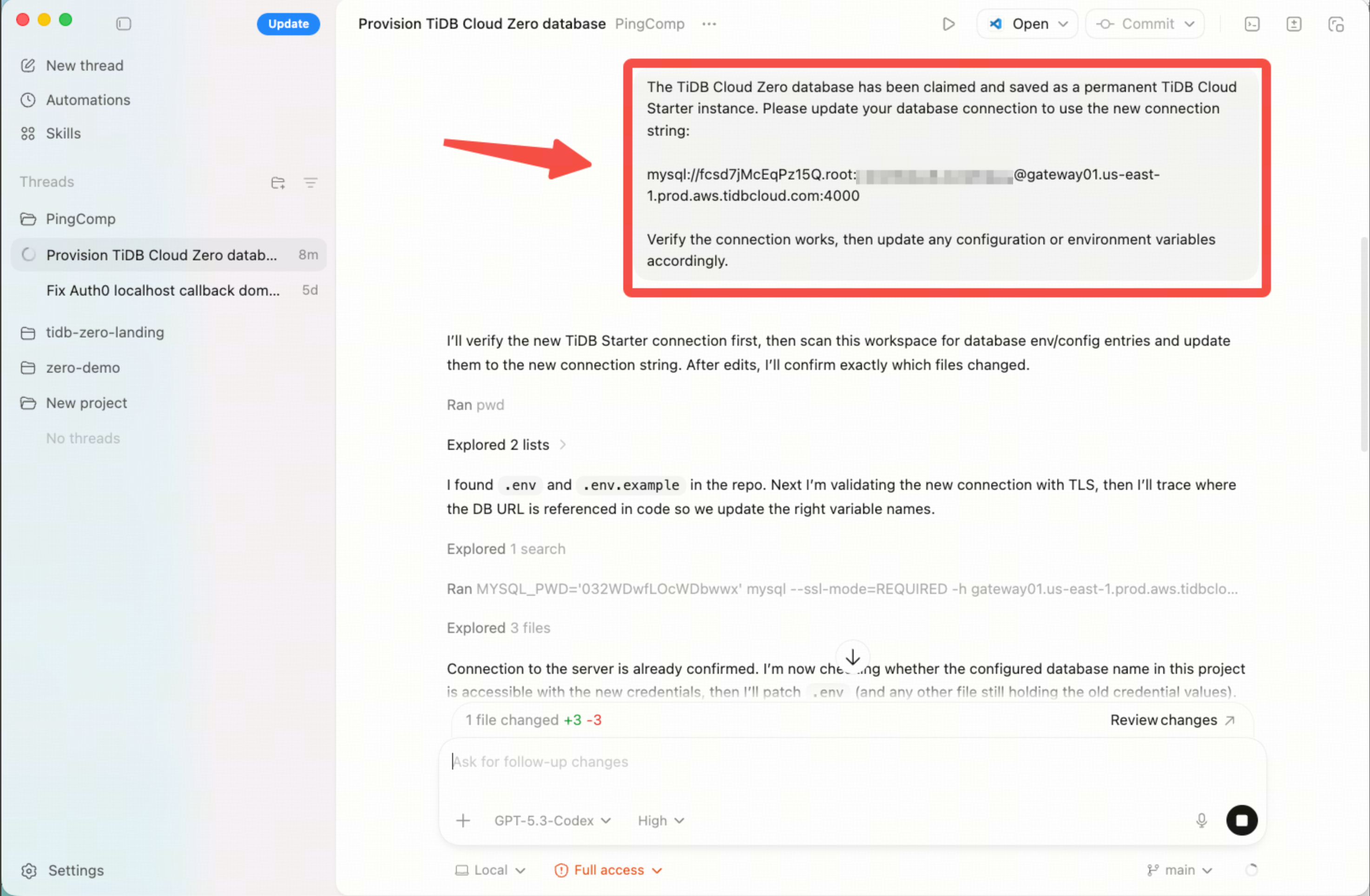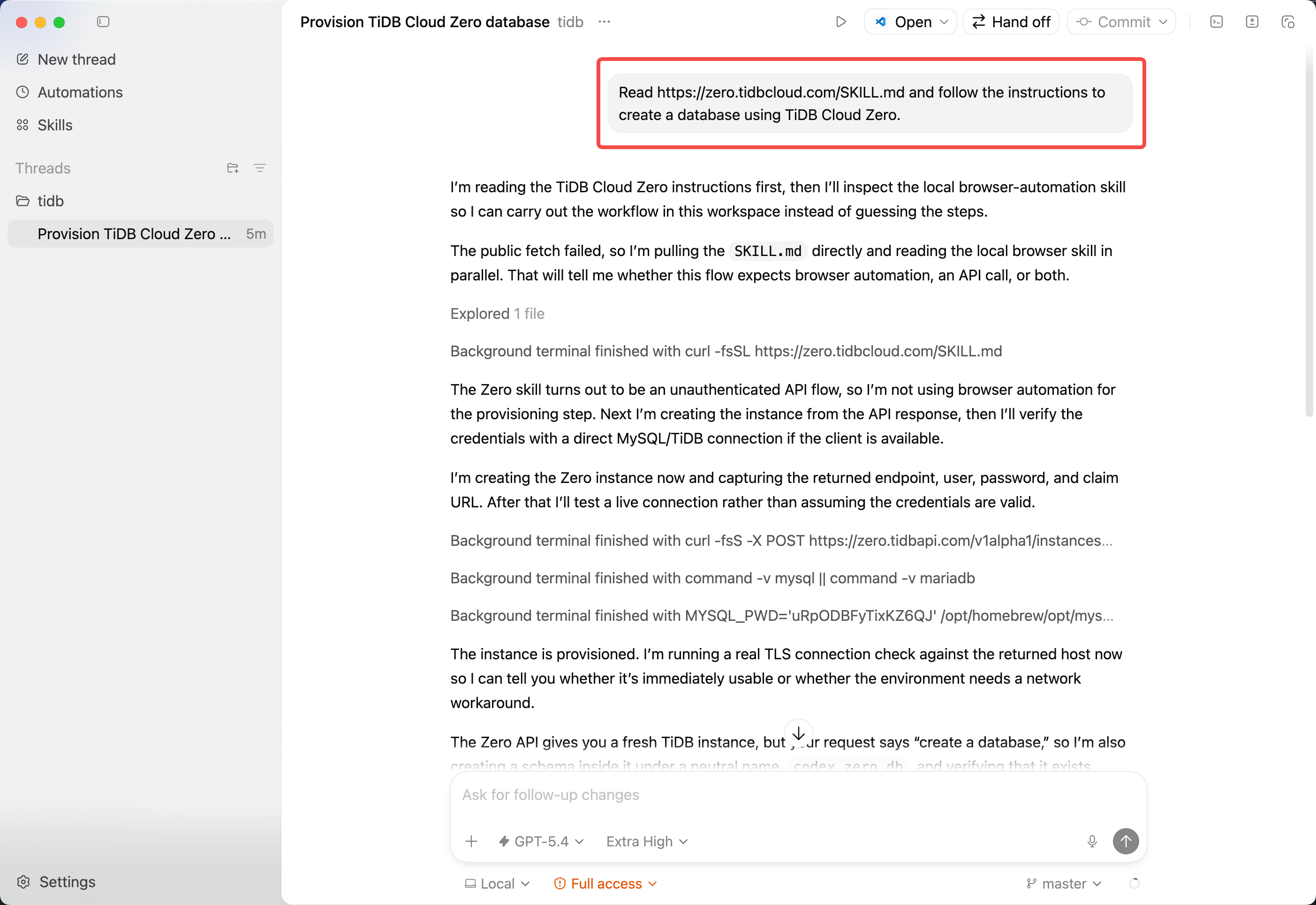 Once the command is executed, the system will automatically provision a TiDB Cloud Zero instance.