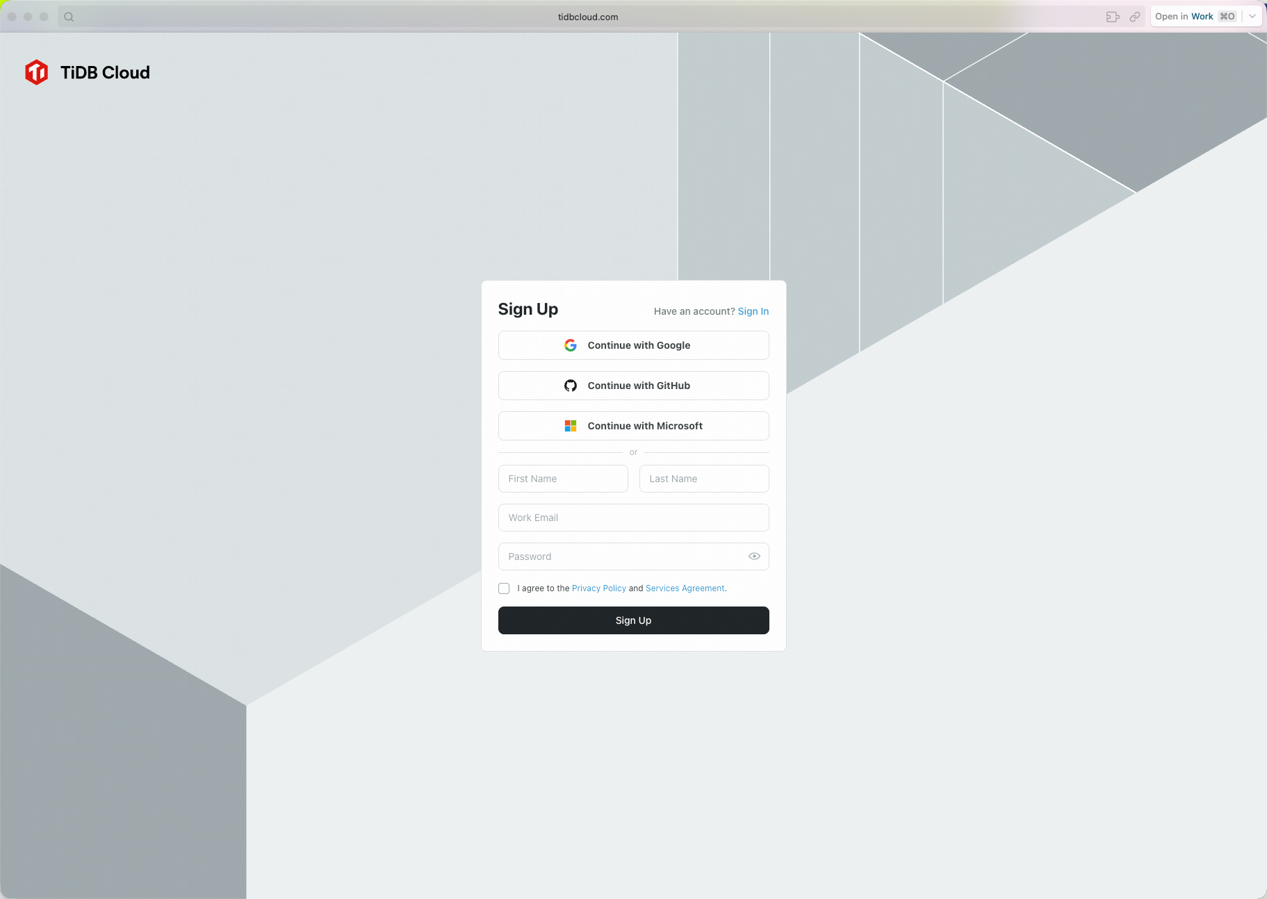 If you’re not logged in yet, the system will ask you to sign up or log in to TiDB Cloud.
