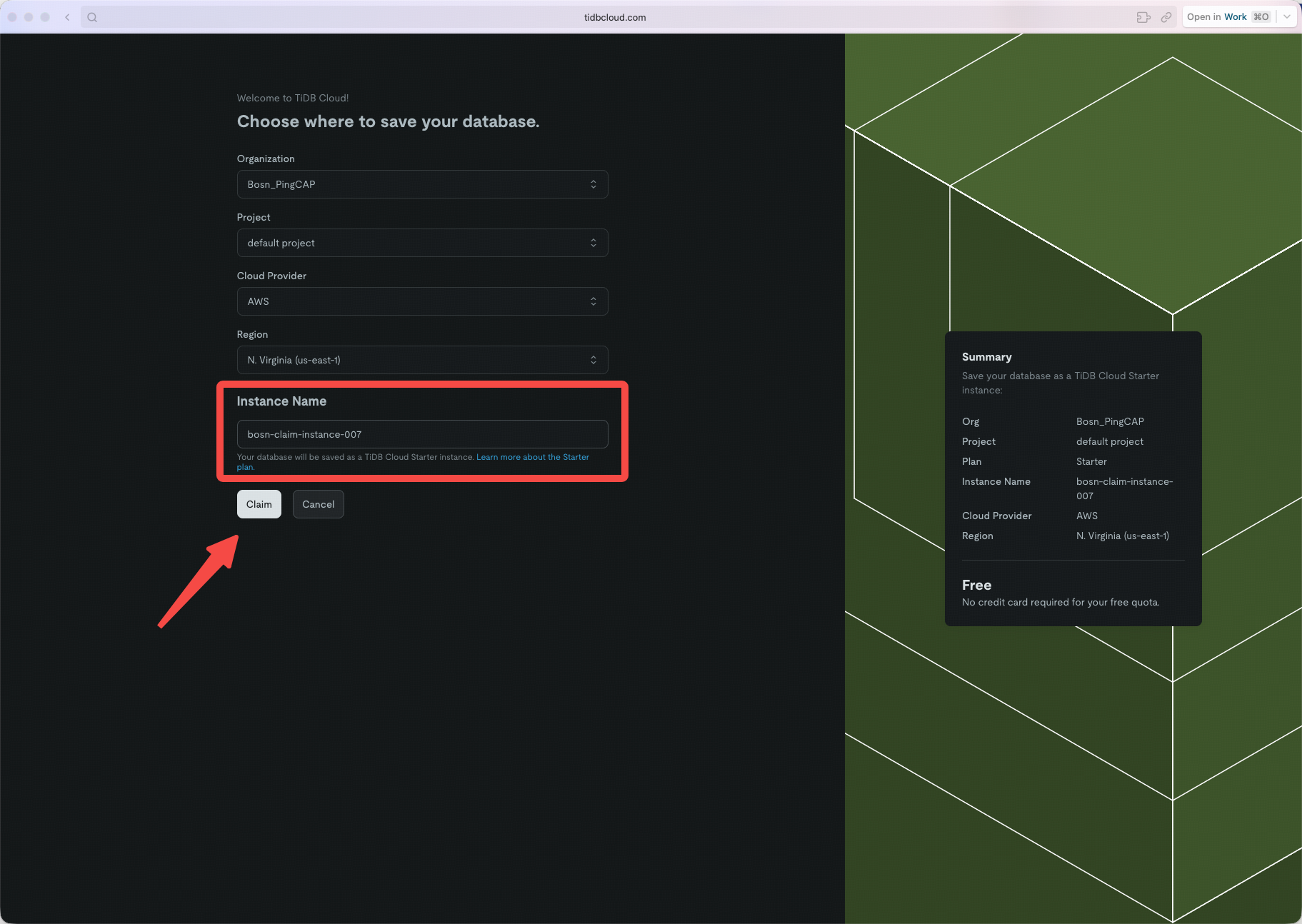 • Three-click claim converts it into a persistent TiDB Cloud database.