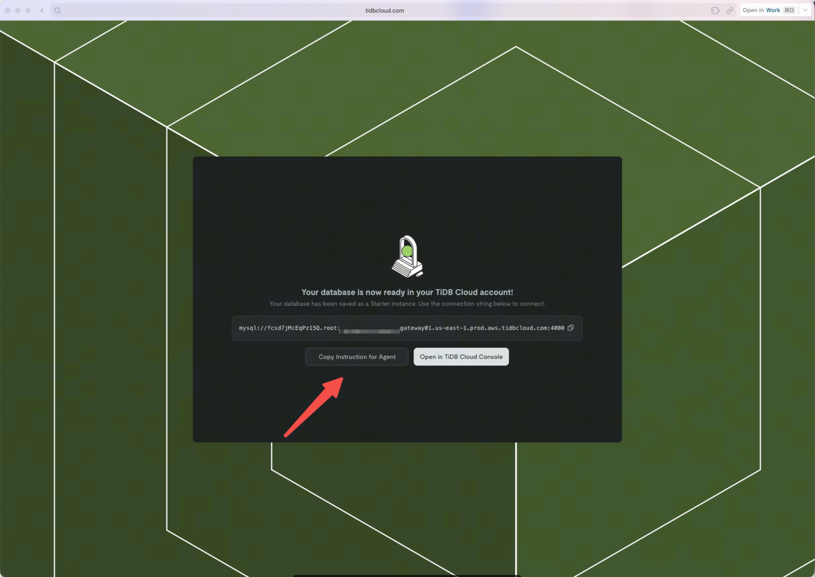 Here you’ll see a SKILL command that allows AI agents to immediately connect to a temporary TiDB Cloud Zero instance.
