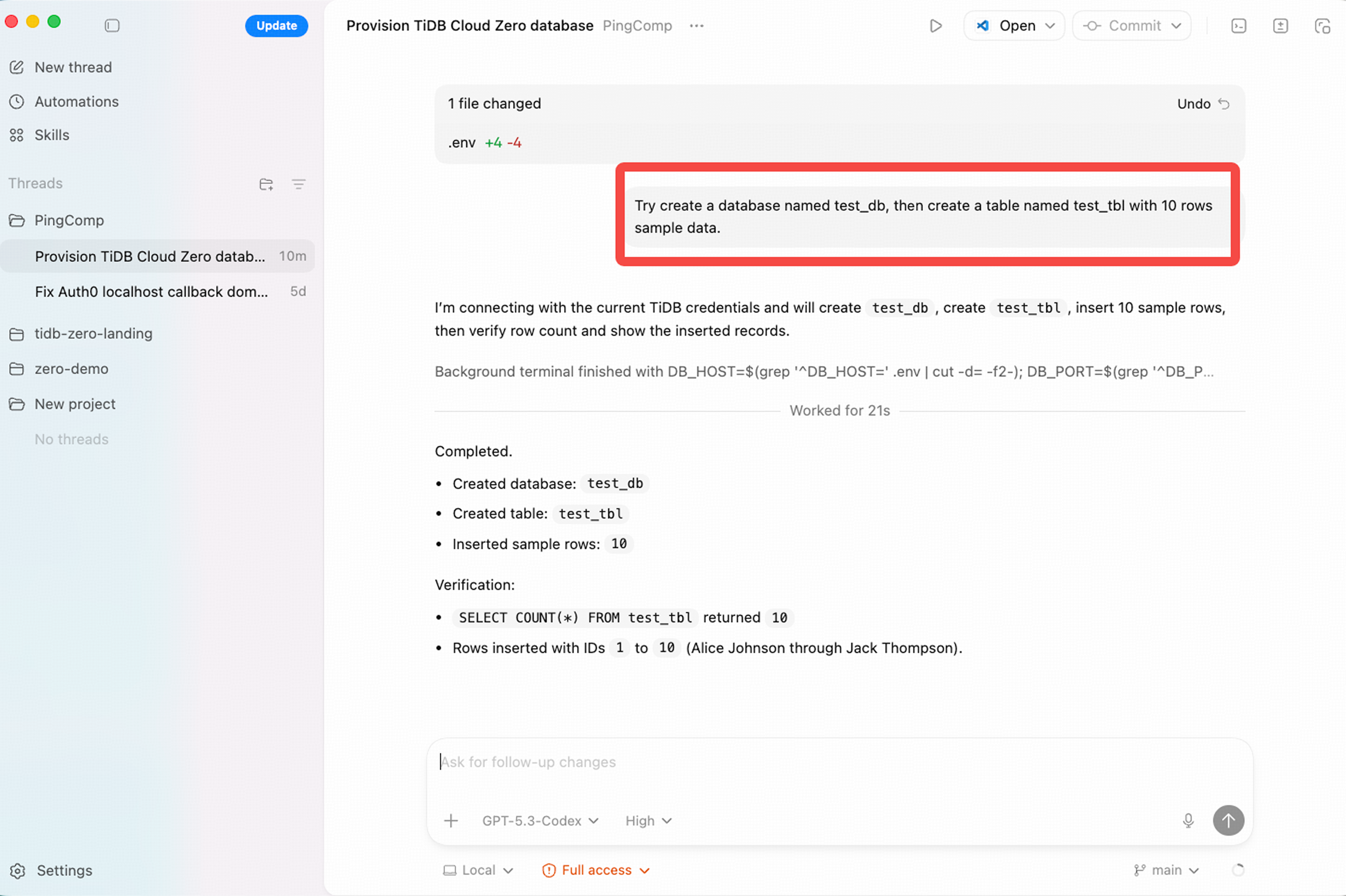 TiDB Cloud Zero fundamentally changes how databases fit into modern development workflows. Instead of spending time on setup, configuration, and access management, you can go from zero to a fully functional, production-grade database in seconds—directly inside your AI agent.