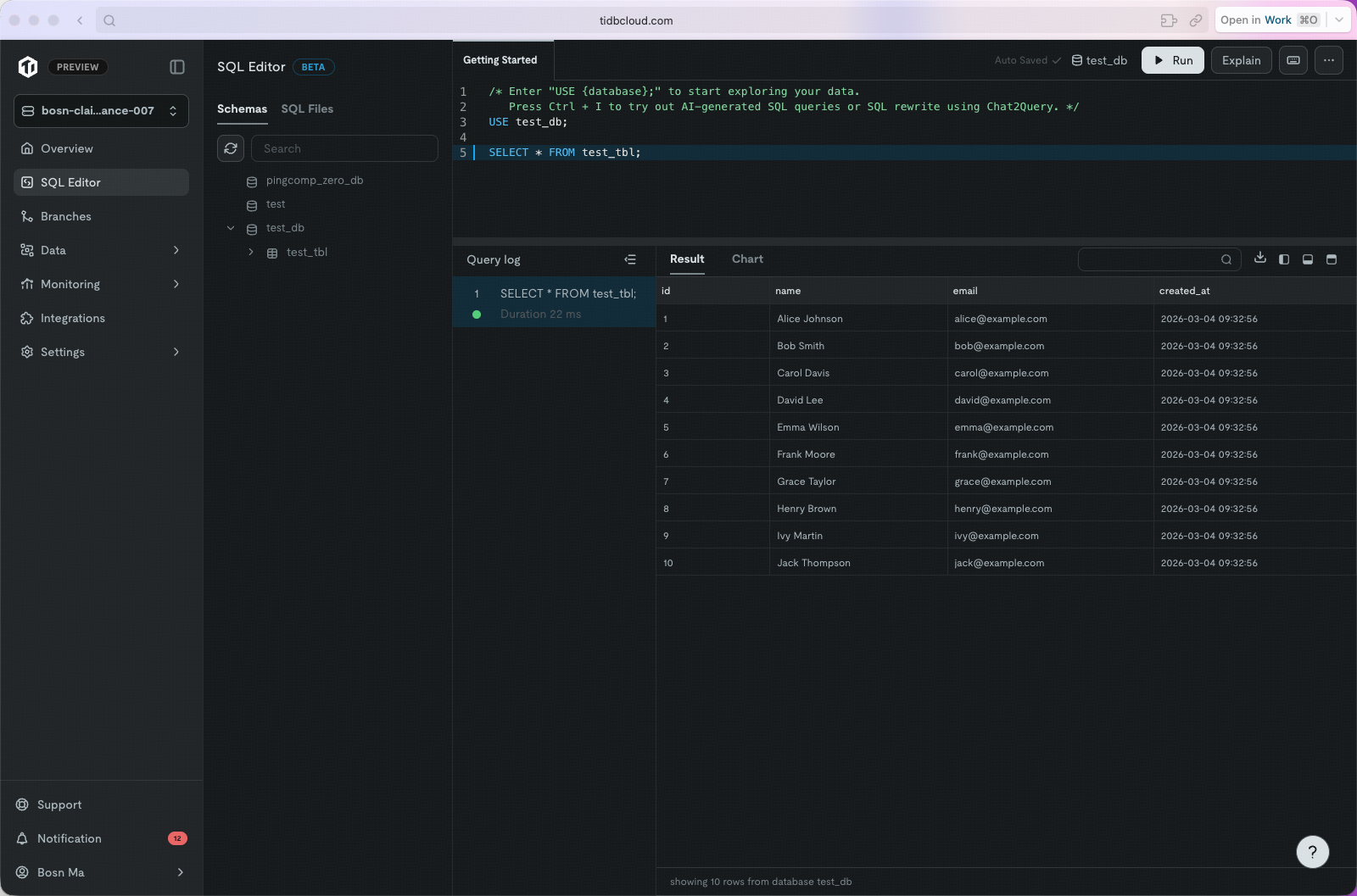 Now, let’s verify the data. You can use the built-in TiDB Cloud SQL Editor, or connect with any standard SQL client you prefer.