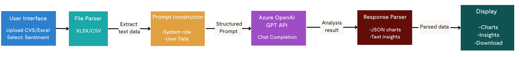 Users upload data (Excel/CSV), select an analysis type, and provide a natural language prompt. The system sends the data and prompt to the GPT model, which analyzes the input and returns structured insights that are displayed immediately.