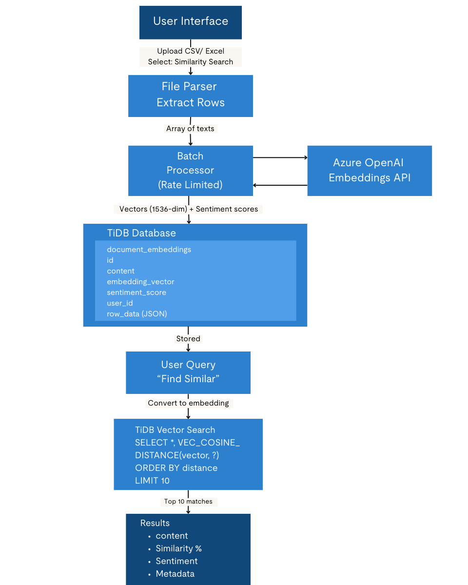 Users upload data, and each text row is converted into a 1536-dimension vector via an API. The vectors are stored in TiDB along with metadata. When a user submits a query, it is also converted into a vector on the server side. TiDB then performs semantic similarity search to retrieve the most relevant documents, and the results, including sentiment scores, are returned from the server to the browser.