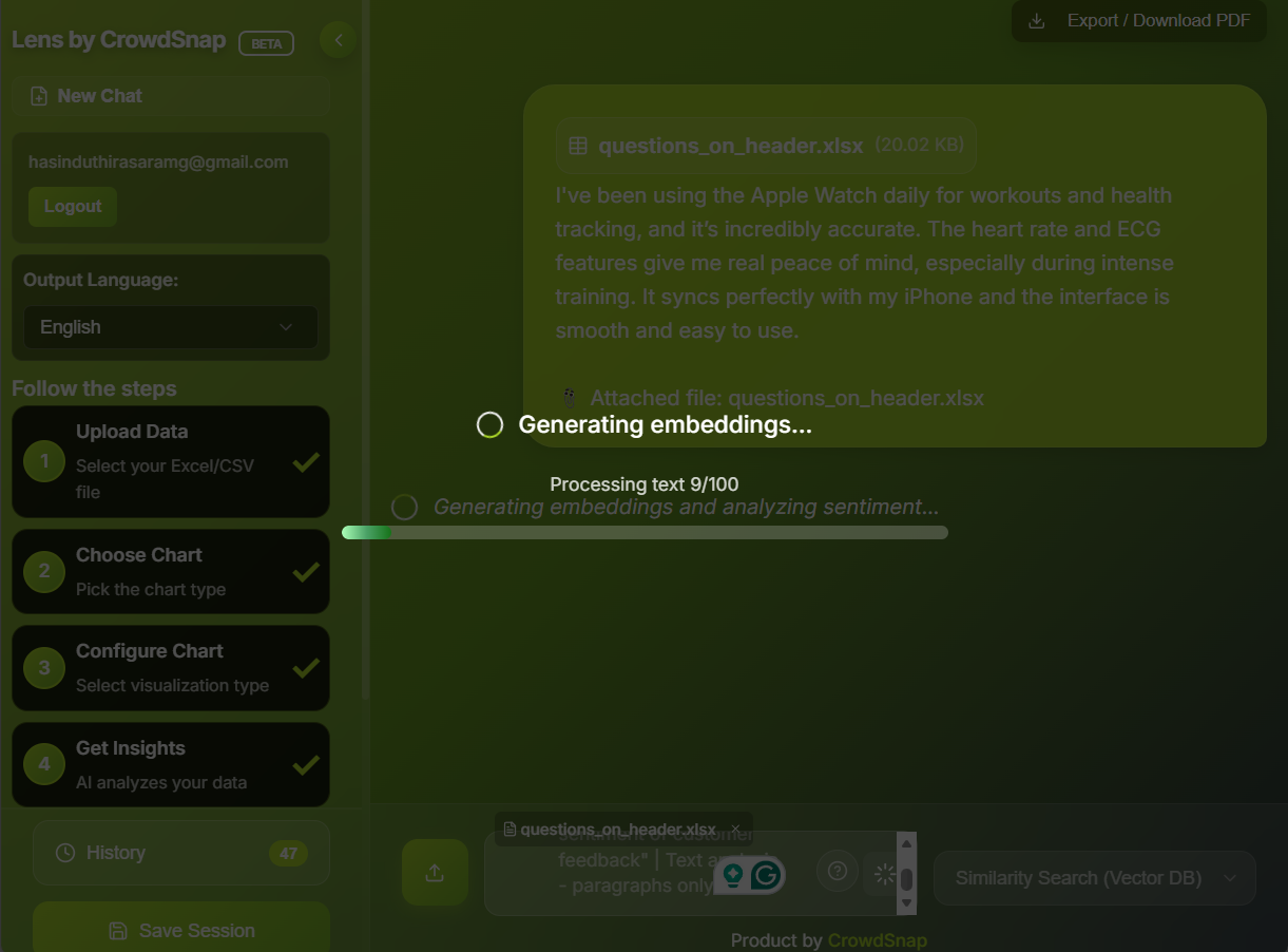 CrowdSnap’s Prompt Analysis lets users upload any dataset (surveys, reviews, feedback) and ask questions in natural language to uncover insights, sentiment patterns, and correlations. Think of it as “ChatGPT for your data,” but with the architectural challenge of doing this efficiently for hundreds or thousands of data points.