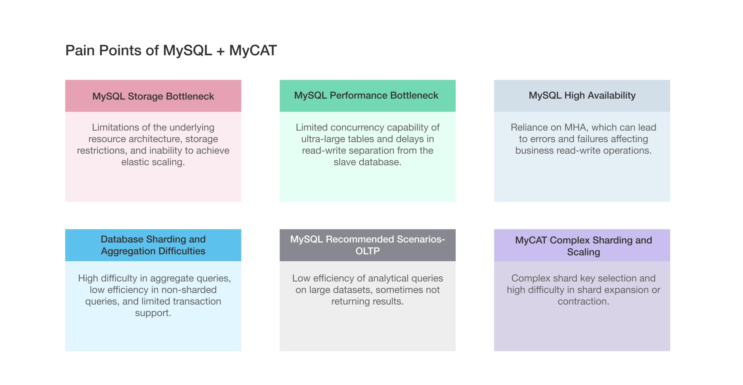 For the MyCAT cluster, shard selection posed a critical challenge. If not properly handled before going live, it could lead to data skew, significantly reducing query performance. Additionally, aggregating data queries was extremely difficult, and there was only limited support for transactions, which added to the complexity of managing the system. Furthermore, in OLTP (Online Transaction Processing) scenarios, where MySQL clusters were primarily used, the efficiency of executing analytical queries on large datasets was notably low.