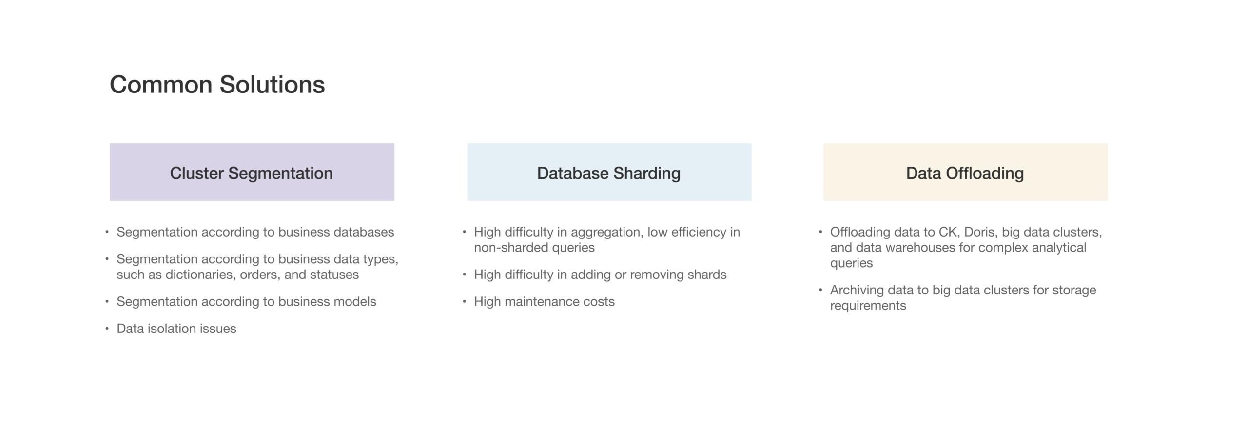 To address the challenges JJ World faced with their existing MySQL and MyCAT cluster architecture, the team implemented several strategies to alleviate the pressure on a single cluster and enhance overall throughput. These efforts included cluster splitting and database and table partitioning. Additionally, JJ World migrated analytical scenario data to specialized analytical databases like ClickHouse and Doris. However, these changes introduced new challenges, such as the creation of data silos, difficulties in ensuring data consistency, and increased operational complexity.