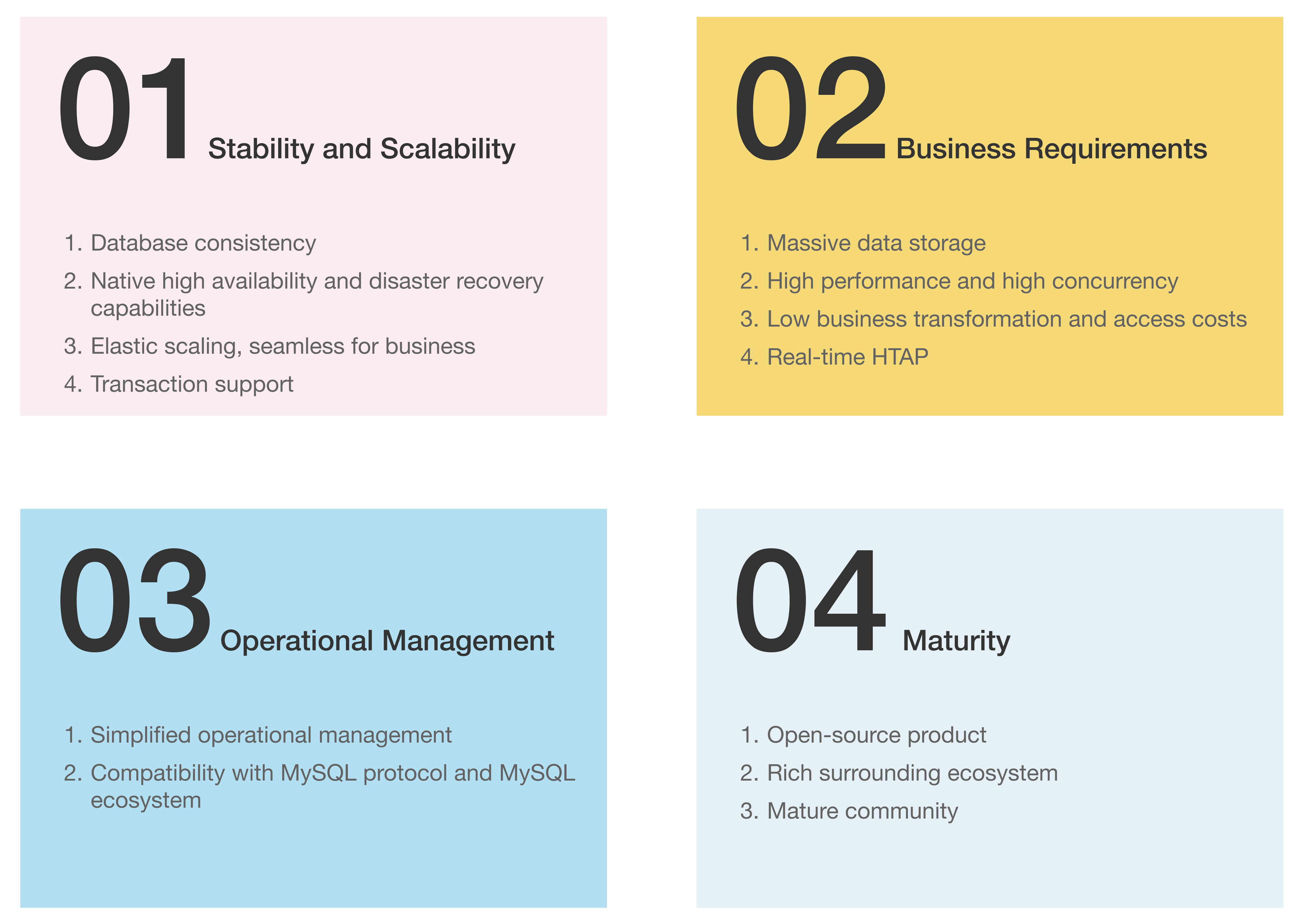 In response to these ongoing issues, JJ World initiated a comprehensive database survey at the beginning of 2021. The selection process was guided by four key criteria: alignment with business scenarios, the potential for architectural evolution, compatibility with the broader technology ecosystem and development trends, and the availability of diversified options. JJ World deliberately chose to avoid an all-in-one solution, focusing instead on a more tailored approach that could better meet their specific needs.