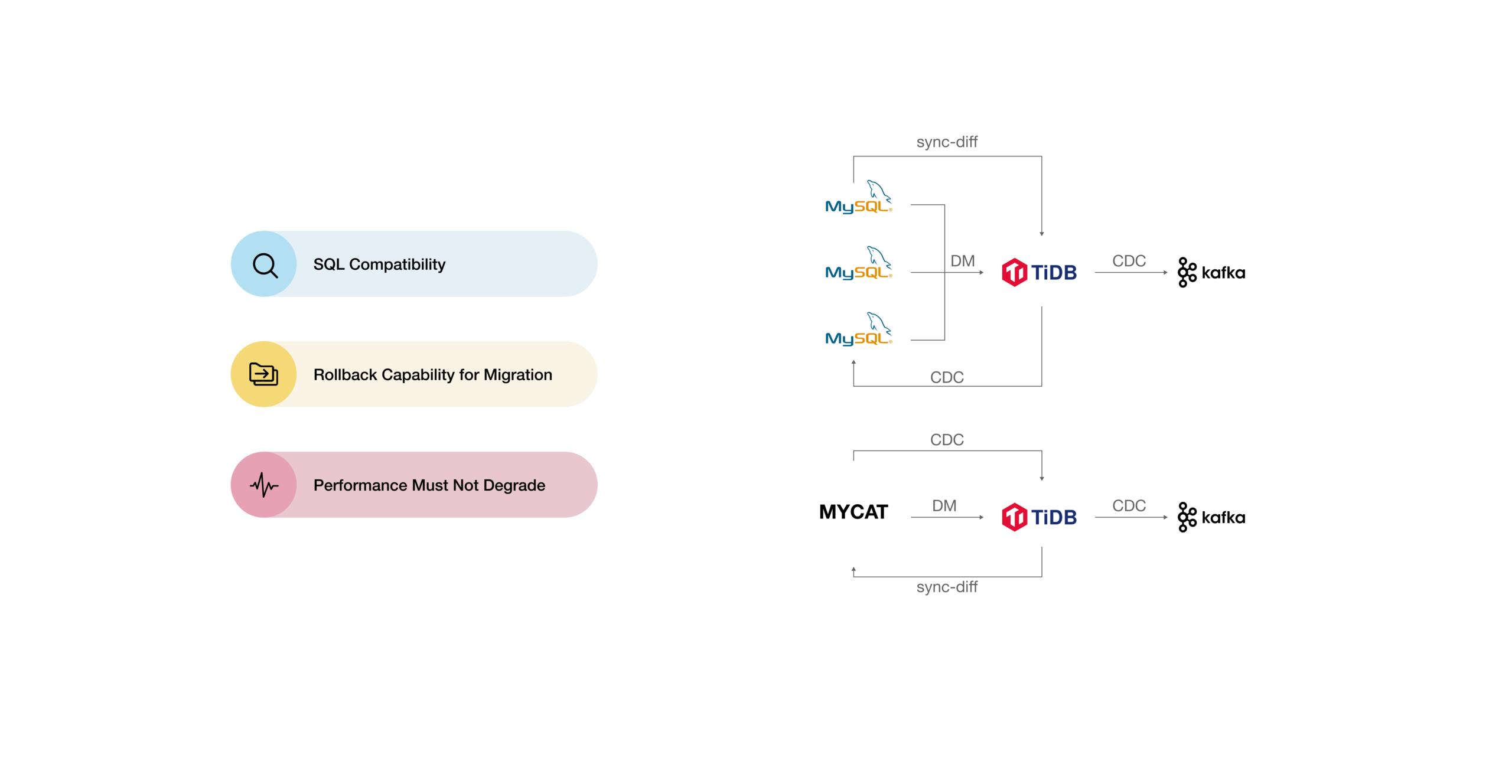 Three basic requirements for migrating from MySQL to TiDB are SQL compatibility, the ability to roll back the migration, and no performance degradation. Based on these requirements, they designed two migration processes for MySQL and MyCAT.