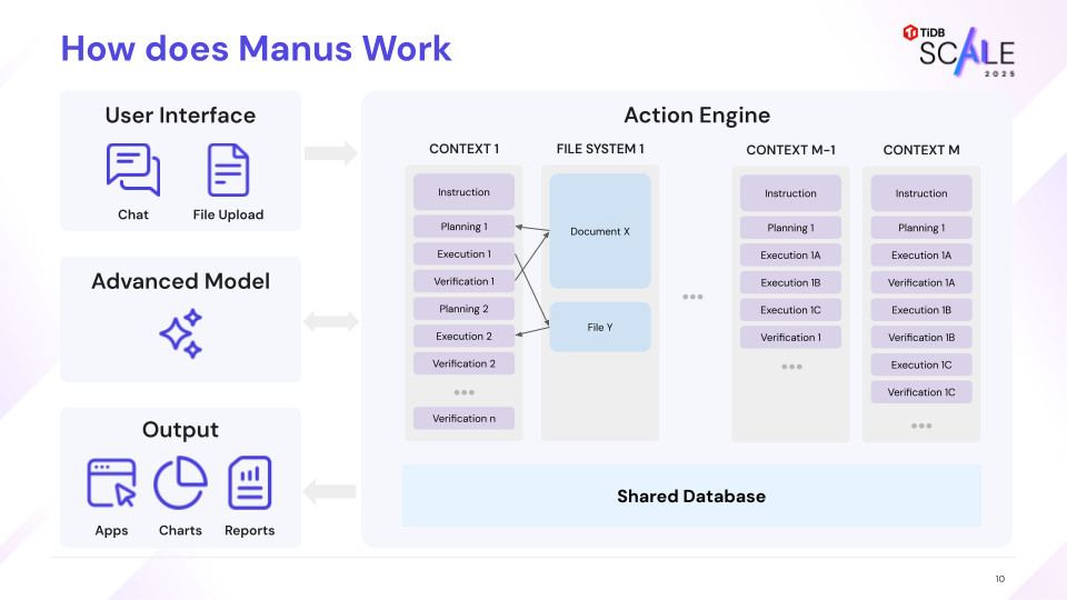The Manus engineering team’s technical blog on “Context Engineering for AI Agents” reflects a core principle: “Use the File System as Context.” This architectural decision directly translates the challenge of long-term memory to the database. This philosophy, and the strategic choice to build on a scalable database like TiDB Cloud, is what later enabled the “Unlimited Context” feature announced in Manus 1.5. When the announcement claims users can “load huge project details without losing track of earlier data,” it is the scalability and persistence of the underlying TiDB X database—chosen months prior with foresight—that makes this possible.