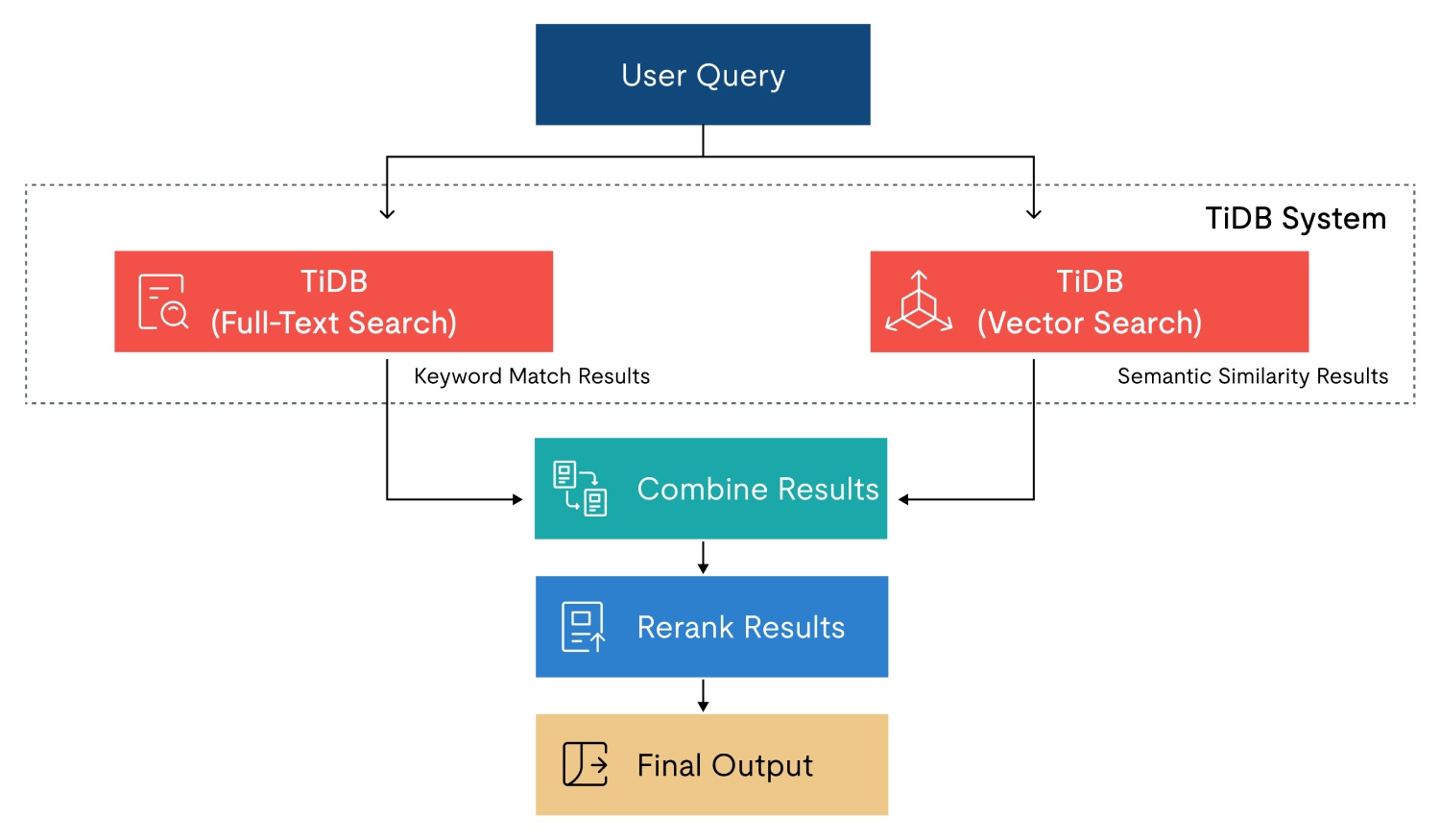Figure 2. Hybrid search flow where TiDB runs full-text and vector search, then results are combined and reranked.