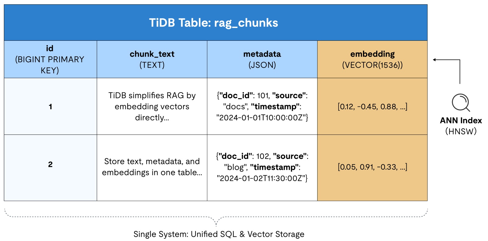 Figure 1. An example of a single TiDB table containing chunk text, metadata columns, and a VECTOR embedding column with an ANN index.
